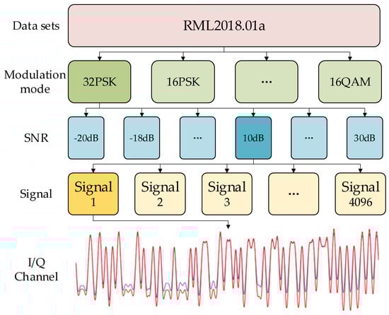 This paper utilized the publicly available RadioML dataset provided by DeepSig Inc., Arlington, VA, USA, specifically version RadioML2018.01a. The dataset consists of 24 different types of digital and analog modulation signals, including OOK, 8ASK, QPSK, 16PSK, 16APSK, 64APSK, 16QAM, 64QAM, 256QAM, AM-SSB-SC, 128QAM, AM-SSB-WC, FM, OQPSK, GMSK, 128APSK, BPSK, 4ASK, 8PSK, 32PSK, 32APSK, 32QAM, AM-DSB-SC, and AM-DSB-WC. The dataset covers a SNR ratio range of −20 to 30 dB. Each signal in the dataset contains both the in-phase I and quadrature Q components, with a length of 1024. The specific structure of the dataset is shown in Figure 3.