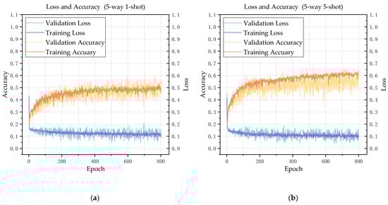 Loss and accuracy of the model under the two classic conditions of 5-way 5-shot and 5-way 1-shot. (a) Loss and accuracy under the 5-way 1-shot condition; (b) loss and accuracy under the 5-way 5-shot condition.
