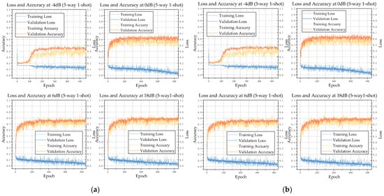 Loss and accuracy of the model under four typical signal-to-noise ratios: −4 dB, 0 dB, 6 dB, and 18 dB. (a) Loss and accuracy under the 5-way 1-shot condition; (b) loss and accuracy under the 5-way 5-shot condition.