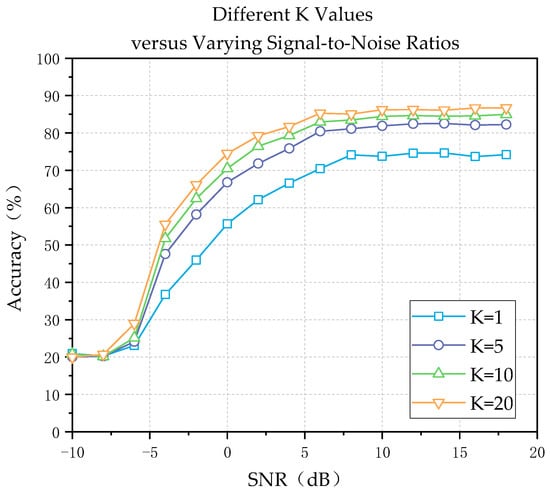 From Figure 6, we observe that when K = 1, the model achieves a recognition accuracy of 75.88% at 18 dB. This indicates that the proposed algorithm performs well even with only one training sample. When K = 5, the model achieves a recognition accuracy of 83.95%, which is an improvement of 8.07% compared to the case when K = 1. As the value of K increases, the average recognition rate of the model continues to improve. At 18 dB, with K = 10 and K = 20, the model achieves recognition accuracies of 86.16% and 88.30%, respectively. By increasing the value of K, we allow the model to learn the differences between classes from a larger sample pool, thus enhancing its generalization capability and performance on new tasks. However, we also observe that the rate of improvement in recognition accuracy slows down, indicating diminishing returns from increasing the number of samples in the support set.