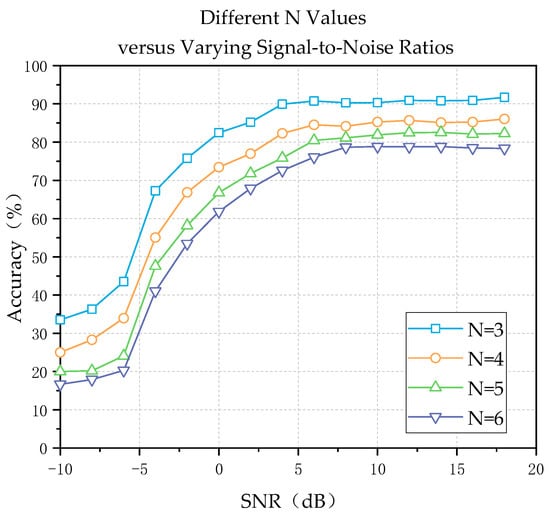 In this section, we investigate the impact of the number of different class samples in the support set, denoted as N, on the network’s recognition accuracy under the N-way 5-shot setting. For each value of N, namely N = 3, 4, 5, and 6, multiple training sessions were conducted, and the average values were computed. The simulation results are shown in Figure 7.