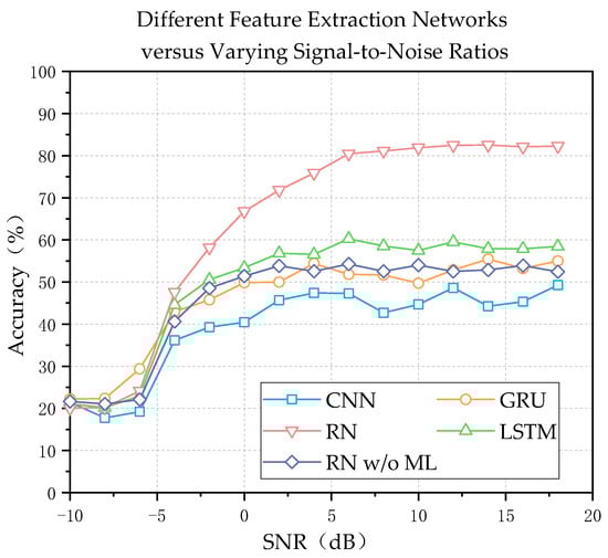 In this section, we conduct a performance comparison between the proposed method and traditional networks under the condition of few-shot learning. The compared methods include CNN [], LSTM [], and Gated Recurrent Unit (GRU) []. The objective is to verify whether the proposed method exhibits strong robustness and generalization capability in handling few-shot problems and whether it outperforms traditional network structures. The traditional networks extracted 600 samples in each training session, while the proposed method is evaluated under the 5-way 5-shot condition with 100 samples. The recognition accuracies of each method as the SNR ratio varies are shown in Figure 8.