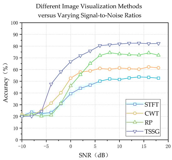 The proposed TSSG method exhibits certain advantages over other methods. Compared to the alternatives, TSSG can achieve convergence at lower SNRs, making it more efficient in practical applications. However, in the experiments conducted in this section, STFT and CWT demonstrated relatively poor performance. This may be attributed to the limitations of these methods in handling non-stationary signals, as they struggle to capture the time-varying characteristics of the signals and provide sufficient information for effective feature extraction and classification. On the other hand, the RP method achieved relatively high accuracy under high SNR ratio conditions. However, the recognition accuracy showed slower improvement with increasing SNR ratio.