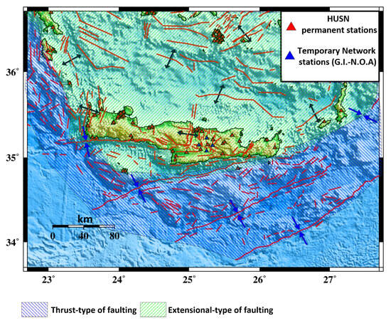 This study focuses on the island of Crete, located at the southernmost tip of the Southern Aegean at the centre of the Hellenic Arc (Figure 1). This area appears to be one of the most seismically active areas in the eastern Mediterranean region, mainly due to intense tectonic movements during the Late Quaternary, which led to a significant uplift in local scale and the creation of extensional faults in approximately the WNW–ESE and NNE–SSW directions [3,13,14,15]. In the Cretan Sea, north of Crete, three primary tectonic depressions are present, located between the Southern Cyclades and Crete, Karpathos, and Rhodes. The main tectonic structures in the region are oriented NW-SE to the west and NE-SW to the east, illustrating the curvature of the Hellenic Arc. The broader area of Crete is characterised by complex geodynamics where transpressional tectonics dominate the southern part of Crete, in contrast to normal and strike-slip forms on the shallow part of the crust, producing a heterogeneous stress field [16,17]. In contrast, in the north, the area between Santorini and Crete, extension is observed [18,19,20,21]. The latter shows extension in a general E-W direction, while N-forward shortening was observed in Western Crete [22]. Specifically, the faults in the area of Western Crete are divided into six categories, according to [23], whose directions are: (a) N130° E, (b) N100° E, (c) N020° E, (d) N075° E, (e) N050° E, and (f) N160° E. Ref. [6] determined that of the fault categories mentioned above, we find mainly normal faults (a–d), while (e) and (f) refer to strike-slip faulting, with sinistral and dextral motion of the slip components, respectively. On the contrary, in Central and Eastern Crete, extension is observed in the NE-SW and NW-SE directions as [24] mentioned.