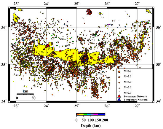 The present work focuses on the island of Crete and its neighbouring regions to the west and east, respectively. Several permanent stations of the Hellenic Unified Seismological Network (HUSN) are operating in this area, complemented by 4 temporary stations (CRE1–4) of the Geodynamics Institute of the National Observatory of Athens (GI-NOA), installed between 27 September 2021 and 15 June 2022, mainly contributing to increasing the depth accuracy of the Arkalochori aftershock sequence for this period of time [29,30,31] (Figure 2).