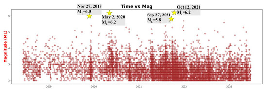 Magnitude (ML)-time (years) of the ML ≥ 2 earthquake occurrences from June 2018 to May 2023.