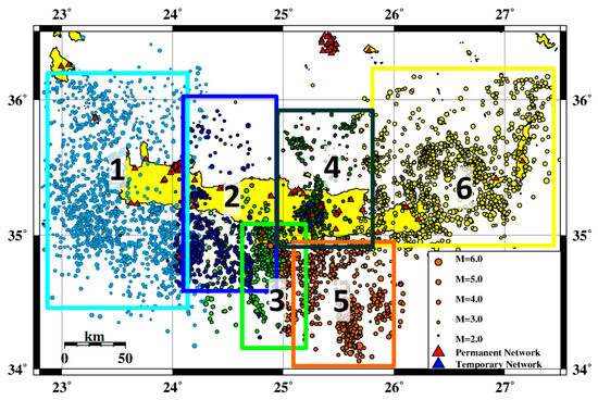 The resulting catalogue was then divided spatially into six smaller regions (Figure 5) using overlapping windows for further analysis and comparison with similar studies conducted in these regions [39]. The events were evenly distributed across both overlapping areas. These areas are: