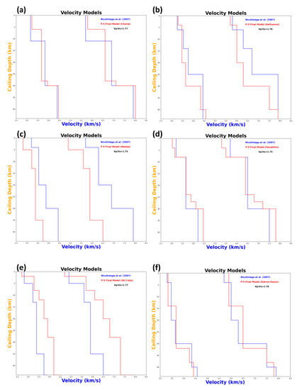 Initial [39] and final velocity models of VP and VS determined by the mean travel-time residuals for the areas of (a) Chania-Antikythera, (b) Rethymno, (c) Matala, (d) Central Crete, (e) SE Crete-Pliny Trench, and (f) Zakros-Karpathos.