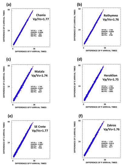 VP/VS ratio obtained using the Chatelain method [42] in the areas of (a) Chania, (b) Rethymno, (c) Matala, (d) Central Crete, (e) SE Crete-Pliny Trench, and (f) Zakros-Karpathos.