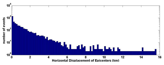 Histogram of the absolute frequency (log scale) of the displacement between the located and the relocated events in km.
