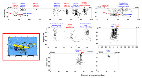 This feature becomes more evident in the cross-section B-B′ that cuts vertically to the HT. This cluster becomes denser in the area that previous studies connected to the activation of a large segment of the HT and the occurrence of the famous tsunamigenic earthquake of 365 in Crete [7,13,25,27,40]. Cross-section C-C′ cuts the eastern part of Crete, from Agios Nikolaos to the area south of Karpathos island. The geometry of the hypocentres as they appear in the performed cross-section reveals the activation of some faults, dipping ~80° to the W, in the 2021–2022 Arkalochori seismic sequence area and two smaller ones, in the area between Agios Nikolaos and Zakros, related to the N-S striking high-angle normal faults. Cross-section D-D′ cuts the central part of the 2021–2022 Arkalochori aftershock sequence volume. In this section and in the respective one of D-D′, we can see two sub-vertical structures whose surface projection coincides with the Avli (~35 km in D-D′) and Kastelli (~45 km in D-D′) normal faults. A smaller cluster of earthquakes is observed in the sections E-E′ and F-F′ in the area SW of Crete Island, coinciding with sub-region 3 (Matala; Figure 11). The relocated hypocentres of these earthquakes are distributed from shallow depth down to about 25 km, possibly related to the Messara fault (E-E′), and a more shallow one (<10 km) connected to the Matala aftershock sequence near the Sivas north-dipping normal fault (F-F′).