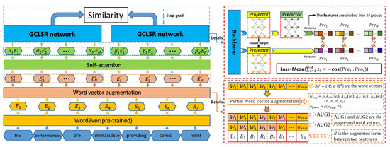 By conducting PWVA and self-attention, the construction of positive samples is finished. Next, we introduce grouped contrastive learning to obtain sentence representation. Generally, the pipelines of contrastive learning are that one first performs data augmentation to produce positive samples, then obtains the features computed by the backbone, and finally computes the contrastive loss [16]. Unfortunately, computing a contrastive loss between high-dimensional vectors could not make use of the local information of vectors well. To solve this issue, we propose the GCLSR to mitigate the aforementioned drawback during contrastive training. As shown in Figure 1, the GCLSR consists of two branches. The first branch includes the backbone, projector [14], and predictor [17], while the other is the backbone and projector. In particular, in order to make use of local information about features, we first divide the features of the projector and predictor into M groups with D dimensionality. The grouped features of the projector and predictor can be denoted as and , respectively. Finally, we use the negative mean of the cosine similarity as the contrastive loss [17]: