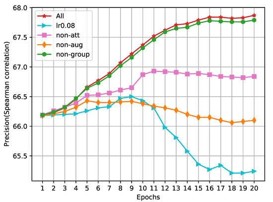 Transfer task is used to evaluate the performance of downstream tasks using sentence representation [36]. Generally, a classifier is added on the top layer of a sentence representation model to evaluate the performance of the transfer task. Note that the classifier (consisting of linear layers) can be trained, while the sentence representation model needs to be frozen. Our proposed method underwent rigorous testing across a spectrum of tasks, including MR [44], CR [45], SUBJ [46], MPQA [47], SST-2 [48], TREC [49], and MRPC [50]. The pre-trained stage is the same as for STS tasks. The evaluation results are shown in Table 3. We find that the overall tendency of results is the same as STS tasks. However, there are two abnormalities that need to be explained. (1) The pre-trained model BERT obtains a better result compared with our proposed model on transfer tasks. Firstly, we only chose sentences from the wiki to perform the pre-training. Secondly, the number of parameters of our model is far less than BERT. Therefore, we take a short time to perform pre-training (about 1 h on 1 Tesla v100 GPU). (2) The application of self-attention and grouping harms the performance slightly compared with GCLSR+PWVA. A possible explanation is that the implementation of PWVA is on word vectors, which could change the original semantic information of vectors. In addition, we do not perform joint training with tasks, which means the model could not digest the learned contrastive features.