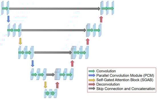 As shown in Figure 2, it can be seen that the PSNet proposed by us is a fully convolutional neural network. Firstly, it is a symmetric U-shaped structure, with the encoder on the left side and the decoder on the right side. Carefully examining the PSNet, there are several Parallel Convolution Modules (PCMs) and several Self-Gated Attention Blocks (SGABs) in the encoder. The main purpose of the PCM is to avoid feature information loss caused by down-sampling and the main purpose of the SGAB is to control the flowing of features, which is highlighting features related to cracks and decreasing the weight of features unrelated to cracks. Additionally, it is noted that the SGAB could choose features in two dimensions, the channel dimension as well as the spatial dimension. Moreover, traditional convolution layers are used in the encoder to connect the PCM and the SGAB while extracting abstract high-level features. As for the decoder, we could see that several convolution layers and deconvolution layers are used to decode features generated from the encoder for the purpose of generating the label map.