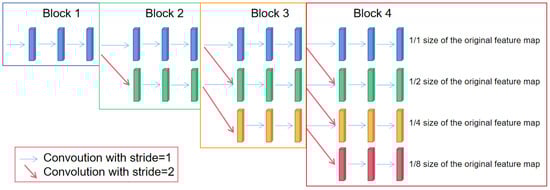 To solve the problem, we propose a Parallel Convolution Module (PCM). Figure 3 shows the structure. Firstly, input features would be input into block 1 for initial feature extraction, then the output of block 1 would be input into block 2. It is noted that block 2 would extract features with two kinds of resolutions, because it sets the stride of the first convolution layer of the two branches into 1 and 2, respectively. Thus, feature maps with resolution of 1/2 and feature maps with original resolution would be generated. After that, these two kinds of feature maps would be input into block 3. Additionally, through setting the stride of the first convolution layer of the three branches into 1, 2, and 2, respectively, block 3 would generate feature maps with resolutions of 1/2, 1/4, and 1/1. Finally, these three kinds of feature maps would be input into block 4. Through setting the stride of the first convolution layer of the four branches into 1, 2, 2, and 2, respectively, block 4 would generate feature maps with resolutions of 1/2, 1/4, 1/8, and 1/1. Therefore, feature maps with different resolutions would be acquired through continuous fusion of four blocks, which would effectively avoid feature information loss caused by down-sampling. In addition, these feature maps generated from block 4 would be up-sampled into same size and would be added together to input into the next layer.