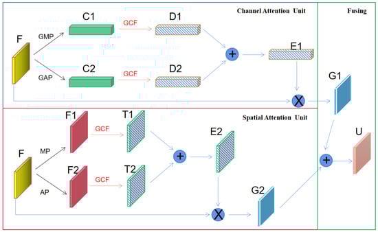 In the Fusing step, the feature map generated from the Channel Attention Unit and the Spatial Attention Unit were added together to generate the final output feature map U. It can be seen that U not only controls features flowing in the channel dimension, but also it controls features flowing in the spatial dimension.