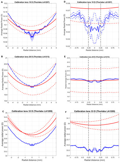 Power profiles for three ophthalmic calibration lenses of +10.00, +20.00, and +33.33 D. (A–C) show the power profile from the center to the periphery. (D–F) show the power profiles in the central area amplified for better visualization. Dashed blue lines indicate the confidence interval of the measurement. Dashed red lines represent the tolerance limits. Black dashed lines indicate the extension of the central zone of the lens within a circle of 0.50 mm diameter. Notice that the maximum aperture radius for (C) is lower than that of (A,B) due to the limitations of the NIMO TR1504.