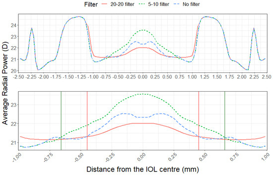 Figure 5 illustrates the average radial power obtained for the ReZoom lens. The application of filters during the measurements revealed that the 20/20 filter affected a central zone with a diameter of approximately 1.25 mm, while the 5/10 filter had an impact on a central area less than 1 mm in diameter, in comparison to the measurements obtained without any filter.
