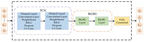 - The parameters of SSA and TCN-BiGRU are initialized, the composed new data are inputted into the TCN-BiGRU model as shown in Figure 5, and the number of iterations, learning rate, number of neurons, and a convolution kernel size of the TCN-BiGRU are optimized via SSA to obtain the optimal model parameters and improve the prediction accuracy.