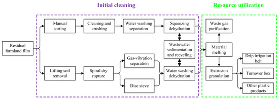 Mulch cultivation technology is crucial for the development of dryland agriculture, where water resources are limited. It plays a critical supporting role in ensuring national food security [1]. Millions of tons of plastic mulch are used globally every year, with China alone requiring more than 1.15 million tons per year [2]. The mulch is not recycled in time and is difficult to degrade naturally, which leads to serious white pollution in farmland soil. Japan, Europe, and the United States use mulch products that are generally between 0.15 and 0.02 mm thick and have good toughness, allowing for complete recycling after crop harvest. Other Asian countries, such as China, generally use ultra-thin mulch with a thickness of <0.008 mm, which makes it difficult to recycle after crop harvest because of broken mulch. Moreover, the residual film is a polyethylene material, which is a valuable renewable resource that can be used to process plastic pellets, forming a virtuous cycle of “use-recycle-process-reuse” of the film, as shown in Figure 1.