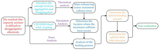 During separation in a residual film–impurity mixture wind separator, a large amount of residual film–impurity mixture is not depolymerized during continuous operation. Herein, we conducted simulations and presented insights for addressing this problem. Based on the principle of agglomeration and depolymerization of the residual film–impurity mixture, the key factors affecting the depolymerization were analyzed. Using CFD-DEM fluid-solid coupling simulation, the location of the maximum collision force was determined, and force analysis was conducted for this stage. The maximum collision force was influenced by the feeding volume and inlet structure. Simulations were performed for different types of inlet structures. The maximum collision force of the residual film–impurity mixture agglomerates on the trommel screen was used as the evaluation index, and the optimum inlet structure and feed rate were determined. Figure 3 shows the flow chart of the complete research process for some mixtures that are difficult to disaggregate. The findings of this study provide theoretical insights for determining the optimal inlet structure and feed rates of various cleaning devices.