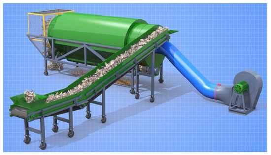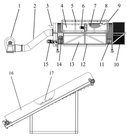 The whole structure of the tumbler sieve-type film miscellaneous wind separator considered in this study is presented in Figure 4. The tumbler sieve-type film miscellaneous wind separator mainly comprised a fan, air duct, tumbler sieve, sealing cover, and film collection box. The inlets for material feed and air were located at the same end of the drum sieve. The fan was connected to the air inlet via an air duct. A spacer conveyor belt with a transverse spacer was used to prevent the material from slipping. Both ends of the conveyor belt were connected to the material inlet installed on the side of the separator. A motor was installed at the lower end of the conveyor belt to control its speed [13].