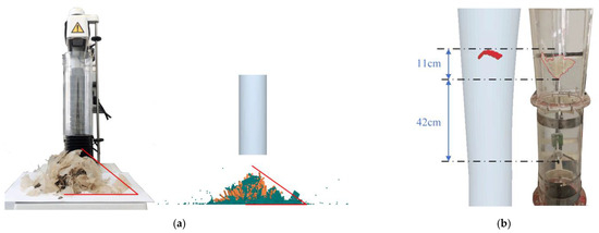 Experimental validation of discrete element models. (a) stacking angle simulation test; (b) suspension speed verification test.
