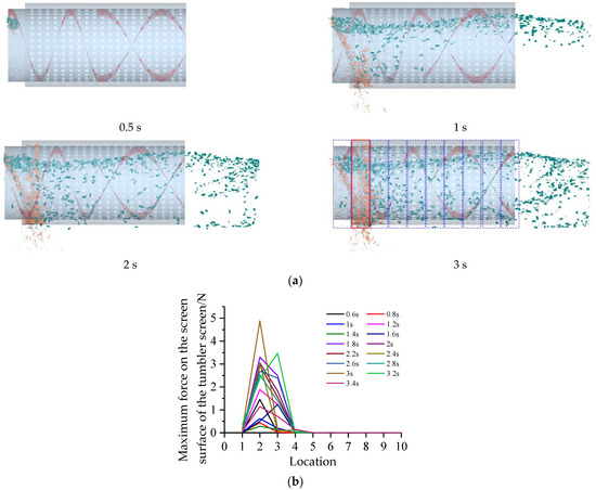 The mass ratio composition of the residual film–impurity mixture was 43% soil, 21% straw, and 36% residual film, and the feeding rate was set to 200 kg/h. A particle factory (a plane that generates particles) was added to the simulation software to produce particles in this ratio (the simulation process is presented in Figure 9a). The starting point was toward the left side of the trommel screen. Monitoring areas (thickness: 300 mm) were designed adjacent to each other. The maximum collision force between the residual film–impurity mixture and the screen surface of the trommel screen was derived for each region at different times. The line graph shown in Figure 9b plots the location against the maximum force on the screen surface of the tumbler screen. The maximum collision force occurred in the area shown in the red solid box in Figure 9a. Further, we determined that the maximum collision force occurred at the lower end of the red solid box, which was where the material first collided with the drum screen surface when it was fed into the device. The magnitude of the collision force in Figure 9b shows that a very small force was generated by the collision between the residual film–impurity mixture and the right side of the trommel screen. When the residual film–impurity mixture was not successfully depolymerized in the red solid line box (Figure 9a), it was challenging to depolymerize with the backward movement of the device. This caused a sudden increase in the impurity content in the membrane collection box. Therefore, to ensure effective depolymerization of the residual film–impurity mixture, in-depth analysis of the material feeding to the stage of collision with the trommel screen was required.