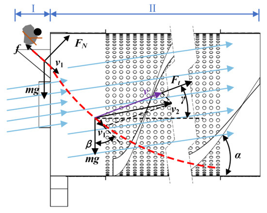 There was a flow field with a horizontal angle α = 8° inside the tumbler screen. The velocity of the material entering the device was v1, and the direction was the same as the inlet slope, that is, β = 45°. The residual film–impurity mixture was subjected to vertical downward gravity (mg) and airflow resistance (Ft) relative to the direction of material velocity, γ, during stage II; the direction of airflow resistance was the same as the direction of movement of the material relative to the airflow, and the airflow resistance, Ft, was calculated using Equation (7):