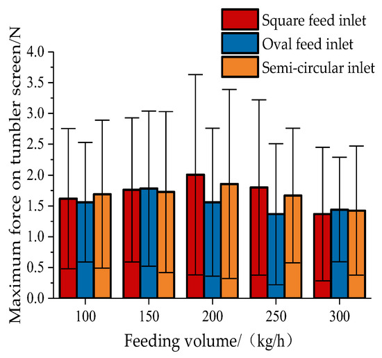 Various forms of inlet structures were simulated. The simulation feeding amount was set according to the proportion of each material mass in the real residual film–impurity mixture. The monitoring area was set up at the position of the red solid line box shown in Figure 9a. The maximum values of the forces on the trommel screen at each moment were determined for each inlet structure. The average value of the statistical results was used as the basis to draw the bar graph shown in Figure 13. The difference between the maximum value and the average value was used as the reference for the error bar.
