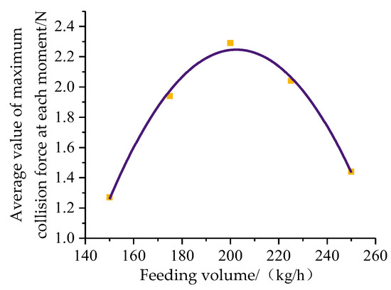 The maximum collision force at all times during the operation of the integrated trommel screen was investigated for different inlet structures. For the square inlet and a feeding volume of 200 kg/h, the collision force between the residual film–impurity mixture agglomerate and the tumbler screen surface was the largest; that is, the agglomerates of the residual film–impurity mixture were most likely to be decluttered. To study the optimal feeding rate of the residual film–impurity mixture under the square feeding port condition, the parameters were further optimized in the range of 150–250 kg/h. The maximum values of the forces on the trommel screen at each moment under different feeding conditions were obtained. The average value was calculated, and a scatter plot was plotted as shown in Figure 14. A curve fit was performed [24,25,26,27,28].