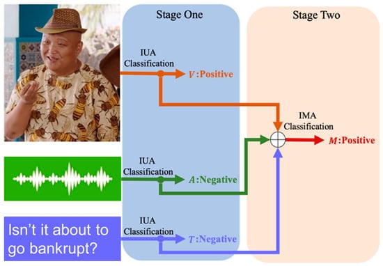 The two most salient components in MEC tasks are unimodal emotion representation learning and multimodal fusion. In many scenarios, unimodal emotion expression differs from multimodal emotion perception, and multimodal annotation stems from the interaction between each modality. Taking a video clip from the CH-SIMS dataset as an exemplar, as illustrated in Figure 1, the text “Isn’t it about to go bankrupt”, with an emotional annotation of −0.8, indicates a negative emotion, and the audio modality annotation is also −0.8. The visual modality expression includes a smile and corresponds to a positive emotional annotation of 1.0. The combination of these three modalities results in a multimodal emotional annotation of 0.6, indicating a positive emotion for the video clip.