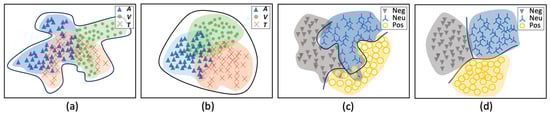 Hypothesized unimodal and multimodal emotion representation. In (a,b), the markers of different colors represent different modalities, and shapes with dotted curves of different colors represent semantic spaces of respective modalities. The black solid curves indicate the envelope of these colored lines. In (c,d), the markers of different colors represent different emotion categories, and the black solid curves represent classification boundaries. V: Vision, A: Audio, T: Text.