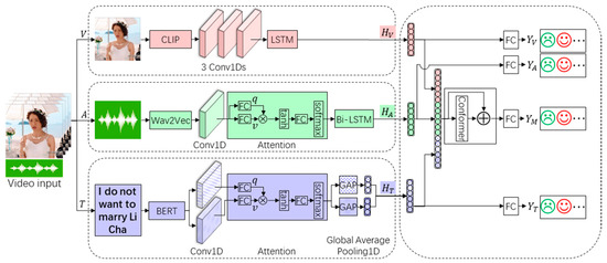 The mixed fusion method requires more computing resources and needs a more refined feature extraction and classifier construction for different modalities, which increases the difficulty and cost of implementation. Recently, many research works have focused on attention-based fusion [63,64,65] and its variants, such as self-attention [66,67], multi-head attention [68,69], and Transformer [70,71]. The attention-based fusion integrates the advantages of early fusion and late fusion and compensates for their shortcomings [64]. Li et al. [63] proposed an attention-based multimodal fusion approach. They first fused the audio and visual modalities, and then fused the resultant fusion result with the text modality. Their approach resolved the problem of asynchronous inputs by using two attention layers to align the inputs and learn their relatedness in an orderly manner. Thao et al. [67] designed a self-attention-based neural network for predicting the affective responses of movie viewers from different input modalities. They implemented a self-attention mechanism using N identical layers, each of which included two sublayers: a multi-head self-attention followed by a feed-forward layer. Each of these sublayers was enclosed by a residual connection, accompanied by layer normalization. Wang et al. [64] proposed a cross-attention asymmetric fusion module, which utilized information matrices of the acoustic and visual modality as weights to strengthen the textual modality. Xie et al. [70] employed a transformer-based cross-modality fusion with a robust deep learning architecture to estimate the emotion during a conversation.