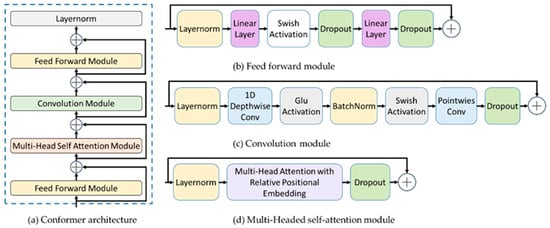 Conformer architecture. (a) is Conformer architecture, (b) is feed-forward module, (c) is convolution module, and (d) is multi-head self-attention module. ⊕: operation of addition.