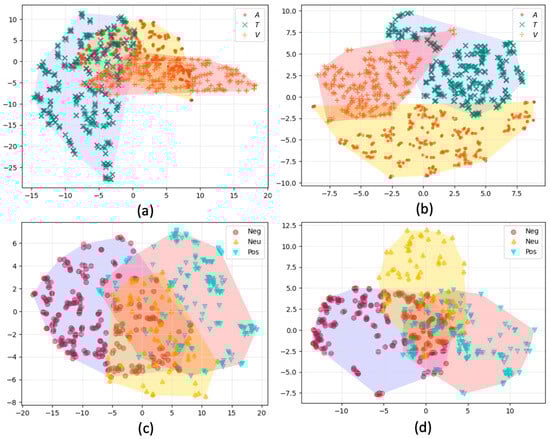 The majority of existing research employs identical multimodal annotations (IMAs) for unimodal model pretraining and multimodal fusion [10,11,12]. The unimodal models trained using IMAs cannot learn satisfactory representations but rather those of forced alignment. The representation of forced alignment will contain certain discrepancies in the distribution of each modality and form an irregular semantic space, as depicted in Figure 2a. Multimodal fusion grounded on this will generate distorted and convoluted classification boundaries (see Figure 2c). If the unimodal models are trained using independent unimodal annotations (IUAs), the representations for each modality are roughly within a unified region and harbor certain differences (see Figure 2b). Leveraging unimodal representations with certain differences such as this for multimodal fusion will contribute to superior fusion outcomes [13]. Meanwhile, the multimodal fusion strategy is also imperative to achieve a comprehensive MEC model. A satisfactory fusion strategy can fully harness the information from each modality and can capture the differences and interactions between modalities. Building upon this, the distributions of each emotion category are uniform, and the classification boundaries are also relatively systematic (see Figure 2d). Most current studies on fusion pay less attention to the unimodal–multimodal emotions’ inconsistency [14,15,16,17] and struggle to learn the differences between different modalities [13].