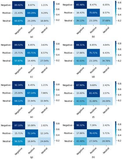 All experiments are carried out using a single NVIDIA (Santa Clara, CA, USA) Quadro P520 card. We adopt Adam as the optimizer with a learning rate of 1 × 10−4, and set the number of epochs to 30 and batch size to 32. All models are trained using sparse categorical cross-entropy on each softmax output. We evaluate the models with accuracy (Acc.) and F1 score. Acc. is equal to the proportion of correctly classified samples to the total number of samples, and can be formulated as follows: