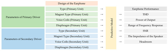 Apart from the design parameters as inputs of the model, the dependent variables, which are the sound performance of the earphone design, will be defined in order to formulate the simplified expression of the prediction. Essentially, six indicators, namely, total harmonic distortion (THD), power of output, range of frequency response, signal-to-noise ratio (SNR), impedance of the speaker, and headroom, were adopted in the formulation of the mathematical model, while these metrics are utilized in the evaluation of the sound performance of the designed earphone.
