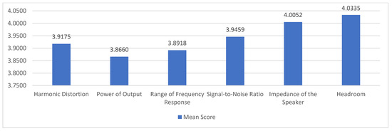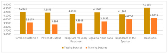 Along with the assigned values, the average score of the designs for the modelling can be computed, and the six average scores of the sound quality performance of the studied earphone design of the training dataset were 3.9175, 3.8660, 3.8918, 3.9459, 4.0052, and 4.0335, respectively (Figure 3). They have a descending ordered sequence: headroom (average = 4.0335) > impedance of the speaker (average = 4.0052) > SNR (average = 3.9459) > THD (average = 3.9175) > range of frequency response (average = 3.8918) > power of output (average = 3.8660), while the best- and worst-performing indicators were headroom and power of output, respectively. Although there were differences among the performance indicators, their performance scores were similar, indicating the dataset’s suitability for modelling.