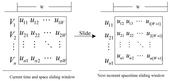 As shown in Figure 1, the sliding size of the acquisition space–time is and rows represent different nodes, where represents the target node and represents a collection of neighbor nodes within the target node range; the columns represent the detected values of the sensor nodes at different times, and indicates the detection sequence of the corresponding node within the nearest moment. When new data are generated, the spatiotemporal sliding window will slide forward one position as a whole, delete the data at the end of the original window, and add new data, so as to update the spatiotemporal sliding window and realize coal mine data acquisition.