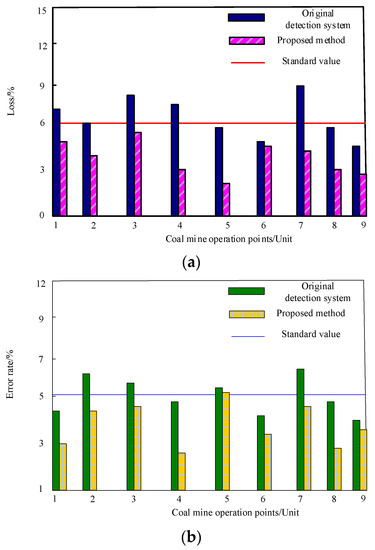 As can be seen from Figure 4a, compared with the standard value, the leakage rate of the original detection method of the group when detecting the nine coal mine operation points exceeded the standard value; at the same time, it can be seen from Figure 4b that, when the original detection method detected Operation Points 2, 3, 5, and 7, the detection error rate exceeds the standard value. Combining the missed detection rate and misjudgment rate of the original detection method of the group in the detection of the 9 operation points in the experiment, it was found that the system was in a fault state when the original method of the group detected 3 operation points and 7 operation points, indicating that the overall operation of the method is unstable; in the 9 coal mine operation points detected by the method, no long-term stability test was carried out to assess the performance of the method in continuous operation, and the number of samples involved in the experiment may appear to be unable to fully represent the overall situation. There is insufficient research on whether the effect of this paper’s method on leakage detection rate control is relatively good or universally applicable, and there is a certain degree of uncertainty in the experimental results. However, the leakage rate of this paper’s method was lower than the standard value when detecting the nine coal mine operating points, and it can control the leakage rate below 3%, which indicates that this paper’s method can effectively control the leakage rate when detecting the microseismicity of coal mines and ensure the stability of the overall detection operation.