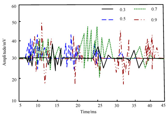 It can be seen from Figure 5 that the wave spectrum presented by this method is different when the inertia weight is set differently. From the comparison of the amplitude fluctuation degree, when the inertia weight was set at 0.7 and 0.9, the amplitude fluctuation was larger; from the aspect of the amplitude fluctuation frequency, when the inertia weight was set at 0.5, 0.7, and 0.9, the amplitude fluctuation frequency was higher, but when the inertia weight was 0.5, the amplitude frequency gradually decreased with the increase of time. When the inertia weights were set to 0.9, the amplitude fluctuation frequency was the highest, and the amplitude reached a maximum value of 50 mV, which was combined with Equation (18) to calculate such that, when the inertia weights of the method were set to 0.9, the detection sensitivity of the method reached a maximum of 55.6 mV.