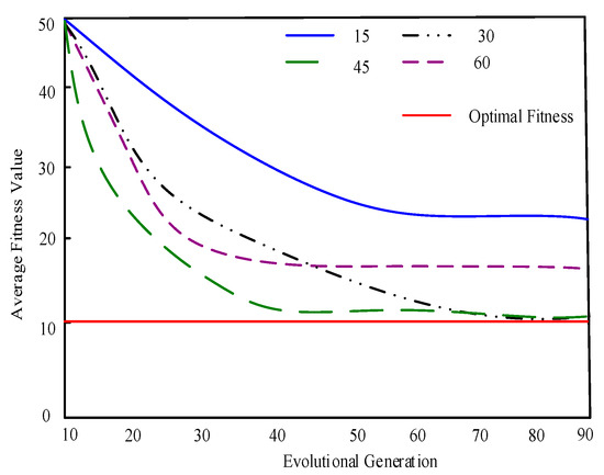 Usually, the number of particles in the PSO algorithm affects the parameter optimization of the SVR model. In this experiment, when testing the number of particles set by this method, the average fitness of the population was closest to the optimal fitness, and the number of iterations was the least, i.e., the parameter optimization effect was the best. It is known that the optimal fitness is 10, the number of particles is set to 15, 30, 45, and 60, the acceleration factor is 2, the position range is restricted to , and the self-learning factor is 2. The specific experimental results are shown in Figure 6.