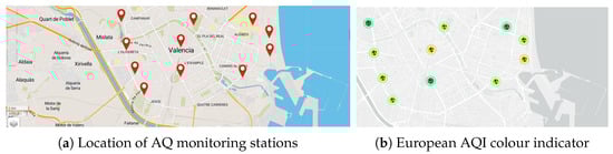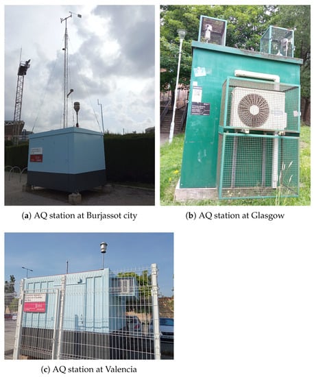 In Europe, air pollution emissions have declined in the last two decades. Despite this positive trend, air pollution remains the most important environmental health risk in this region. The Directive 2008/50/EC of 21 May 2008 on ambient AQ and cleaner air for Europe is one of these AQ measures. According to this directive, the number of sampling points in each zone or agglomeration should be at least one sampling point per 2 million inhabitants or one sampling point per 50,000 km, where the latter criterion results in a higher number of sampling points, but not less than one sampling point per zone or agglomeration. For instance, Valencia city (Spain) is an example where these networks are deployed, with a set of AQ official monitoring stations for polluting gases (the network of stations of the Generalitat Valenciana []) and the stations deployed in the city of Valencia incorporated into open data, also known as Valencia minute by minute []. Figure 1 shows some of these AQ monitoring stations in different cities, such as Burjassot city (SP), Glasgow city (UK), and Valencia city (SP).