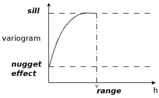 Furthermore, from the set of samples, we need to calculate and model the empirical variogram. The objective of a variogram modelling is to determine the autocorrelation structure of the underlying stochastic process, given by the nugget effect, sill, and range parameters, as depicted in Figure 3. The nugget effect represents the measurement error at for . The sill is the value of when representing the variance of the random field and the range is the distance at which data are no longer auto correlated [].