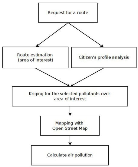 Figure 4 depicts the flow chart and methodology used in our proposal. Initially, the user asks for a specific route, selecting the mode: walking or cycling. Based on his/her profile (or medical history), we retrieve information about pollutants that should be avoided by the user. The user is provided with relevant and critical information, empowering him/her to proactively make informed personal decisions about their route choices and identify potentially unhealthy travel environments.