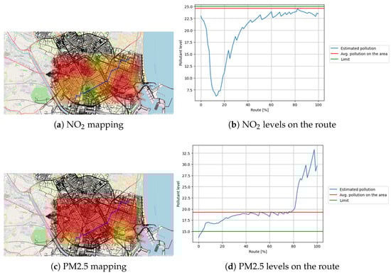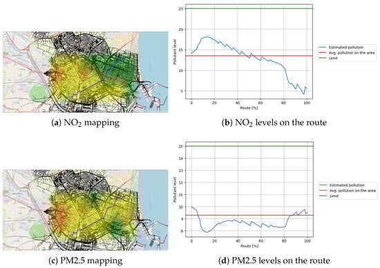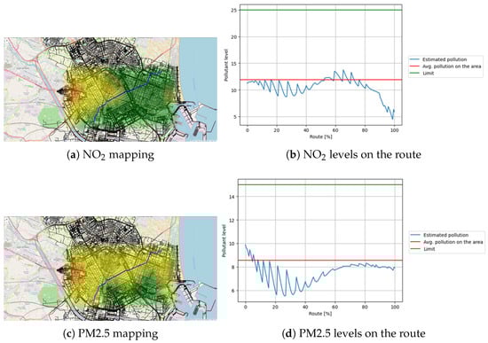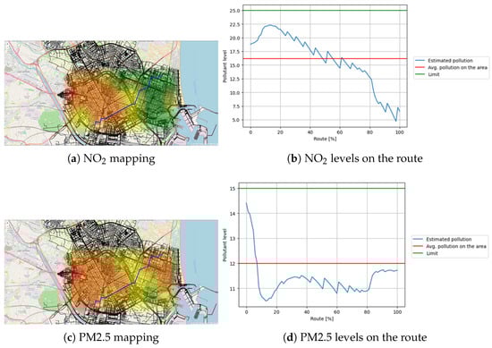 From Figure 10, we see that PM indicators are the worst ones with the highest levels, compared with the other pollutants. This scenario would be a problem in case of respiratory and cardiovascular disorders [] and the user should plan on and decide an alternative, either delaying his/her trip or changing the route, avoiding the city center.