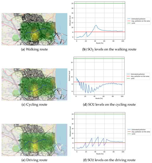 In this case, the time slot used for the analysis is safe in terms of air pollution. Thus, the user can choose any kind of transport mode. It is worth mentioning, as shown in Figure 9c,d, that cycling is a better alternative than walking.