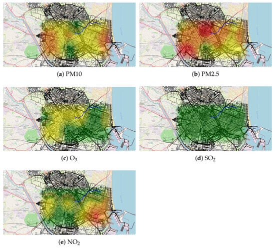 Finally, in this test, we carry out an independent analysis for each pollutant, compared at the same time over the same route. These results are shown in Figure 10. We can see the differences in the pollution levels from different pollutants and how these may affect the route selection.