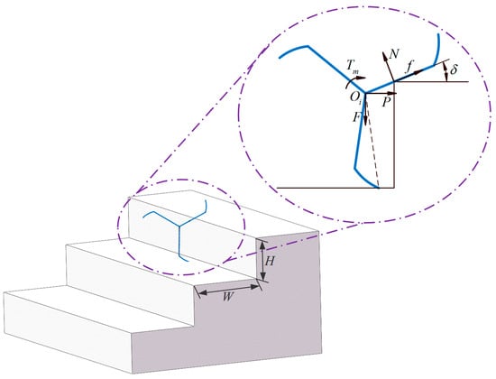 First, the force condition of a single wheel–leg during step climbing is analyzed. As shown in Figure 1, to meet practical needs, it is assumed that the width and height of a single step in a staircase are W = 25 mm and H = 15 mm, respectively. F and P are the component force of the robot body on the wheel-leg in horizontal and vertical directions; N and f are the support force and friction force of the steps on the wheel-leg; MN and Mf are the torque generated by N and f at the geometric center of the wheel-leg; Tm is the driving torque generated by the motor on the wheel-leg; δ is the angle between the tangent of the wheel-leg at its contact point with the step and the horizontal line. It is assumed that the motor speed is slow and that the driving torque provided by the motor is sufficient. Then, Formula (1) can be obtained based on the force balance of the wheel-leg: